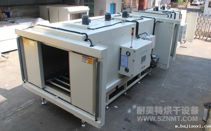 动作流程:设备接收到需要工件进箱信号→当工件进至烘箱前→触发进烘箱前行程开关→进烘箱门自动打开→工件进到烘箱内滚筒线尾端→感应器接触发,阻档器限位→关闭进箱门→(预先设定烘烤温度及烘烤时间)→烘烤时间到达后→设备接收到需工件出箱信号→开出箱门→工件自动输送出→工件输送完成后触发外部行程开关后→并闭出箱门