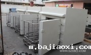(8)烘干箱内可存放1辆推车。推车配置耐高温角轮(定向轮、万向轮各2个),推车里面安装限位柱用于定位里面托盘,两侧配有L形托架,用于支撑及左右限位托盘。进出口装有手动炉门。顶部部置循环风机、蒸气换热器等装置,排废风机安装在炉体顶部。